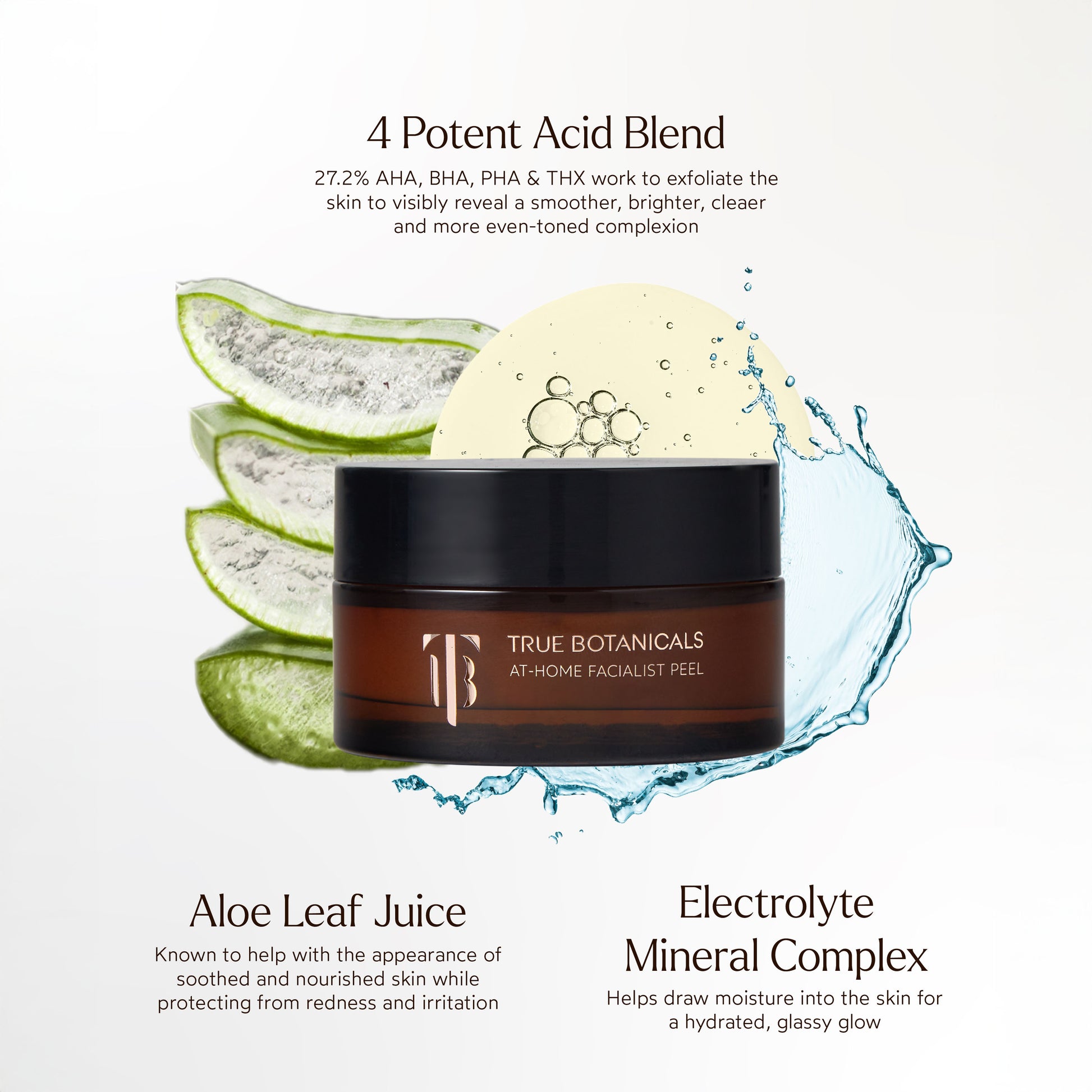 Formulated with a potent 27.2% blend of AHA, BHA, PHA, and THX acids, the At-Home Facialist Peel is uniquely designed to hydrate and nourish as it deeply resurfaces and smooths the look of fine lines and wrinkles, brightens dullness, evens tone, and clears away buildup for a visibly renewed, glass-like complexion.