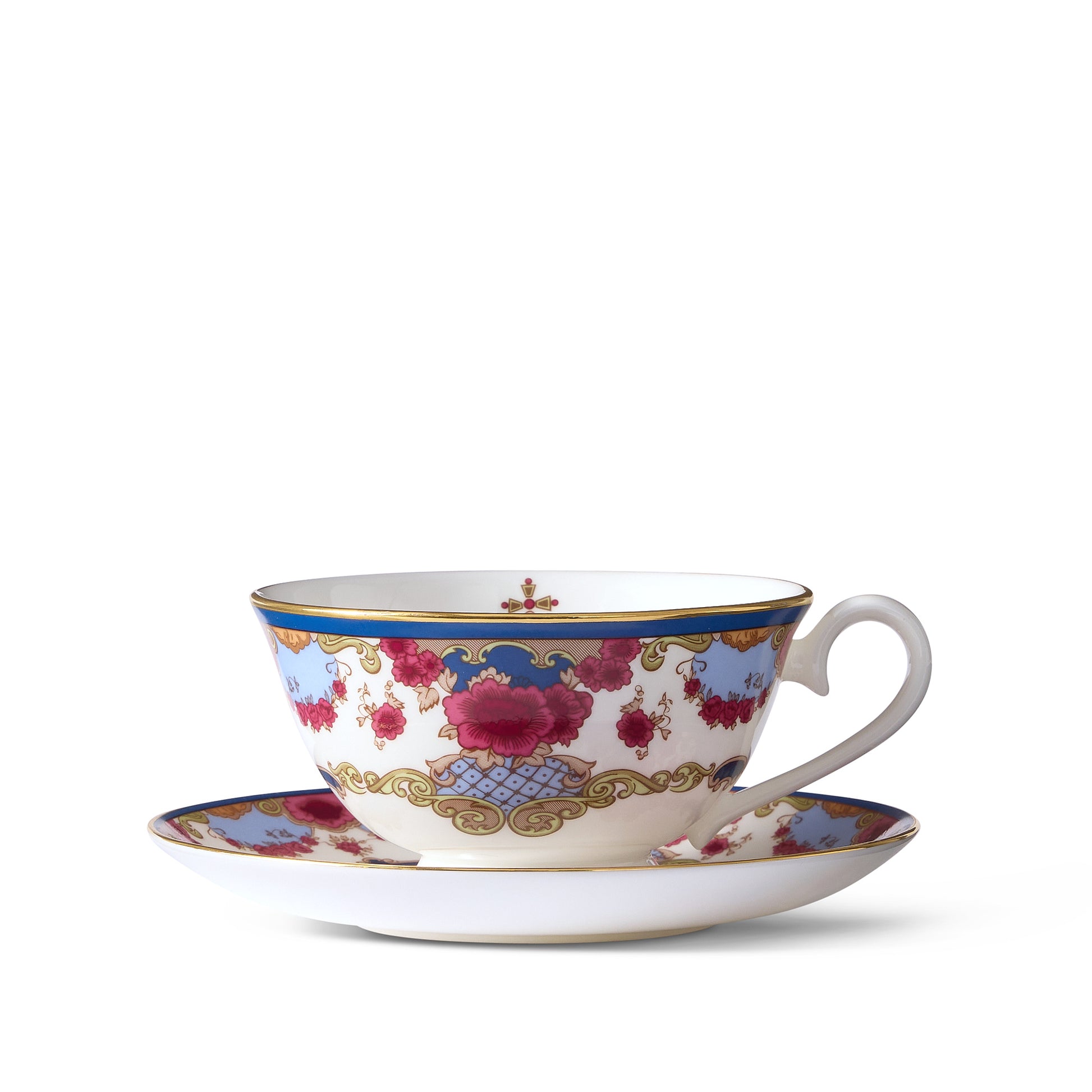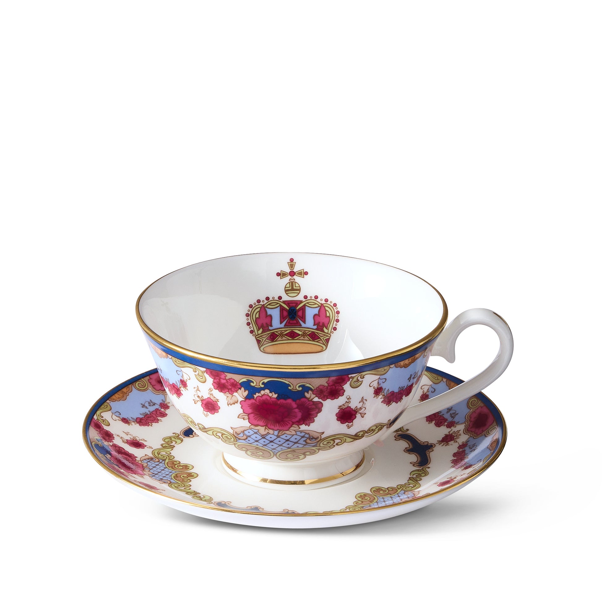 Sip a satisfying cup of tea to slowly reveal the beautiful crown below the rim of this ornately patterned Royal China Teacup with a matching saucer.