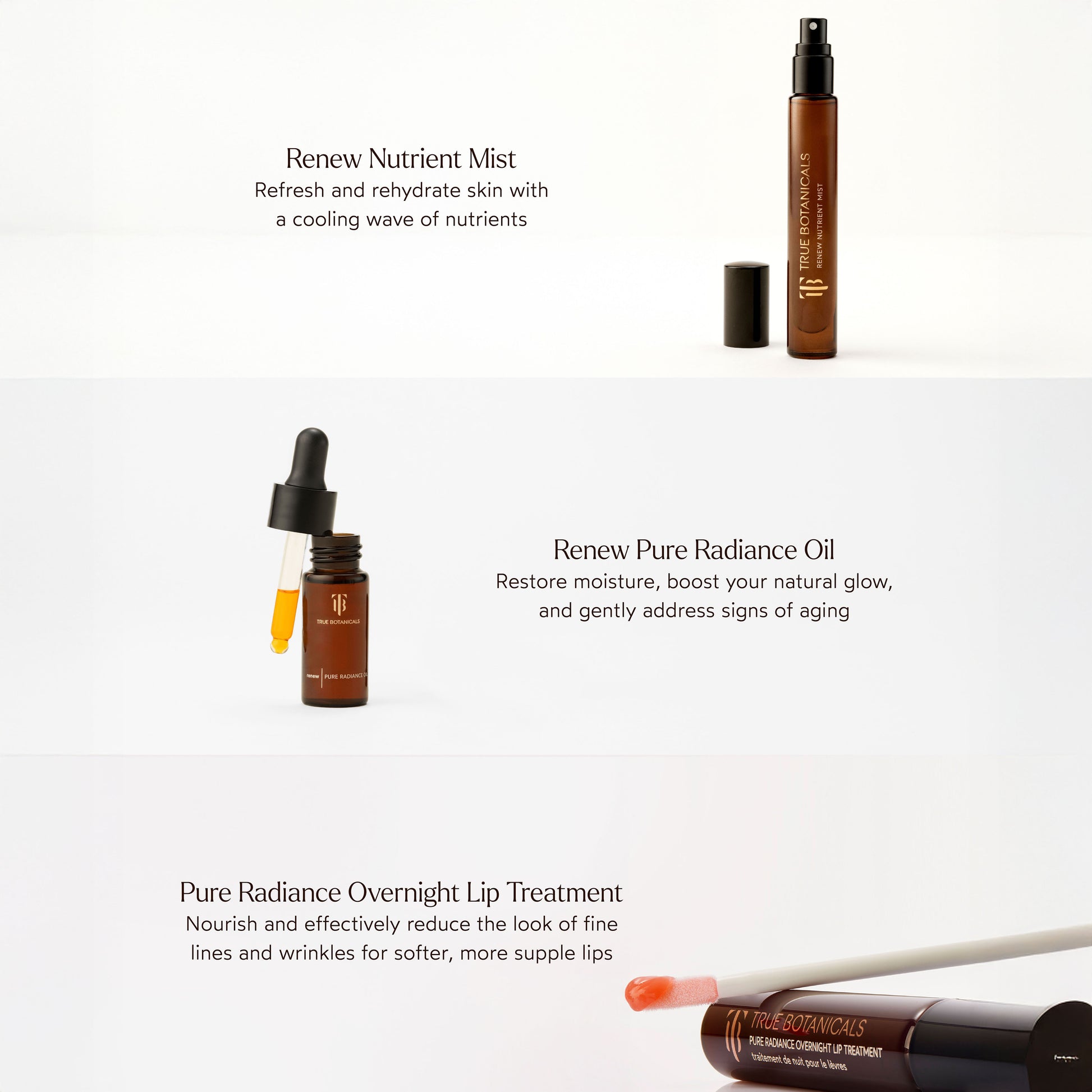 Press 3–8 drops of Renew Pure Radiance Oil into your face, neck, and chest after serum and before moisturizer for lasting nourishment and glow.