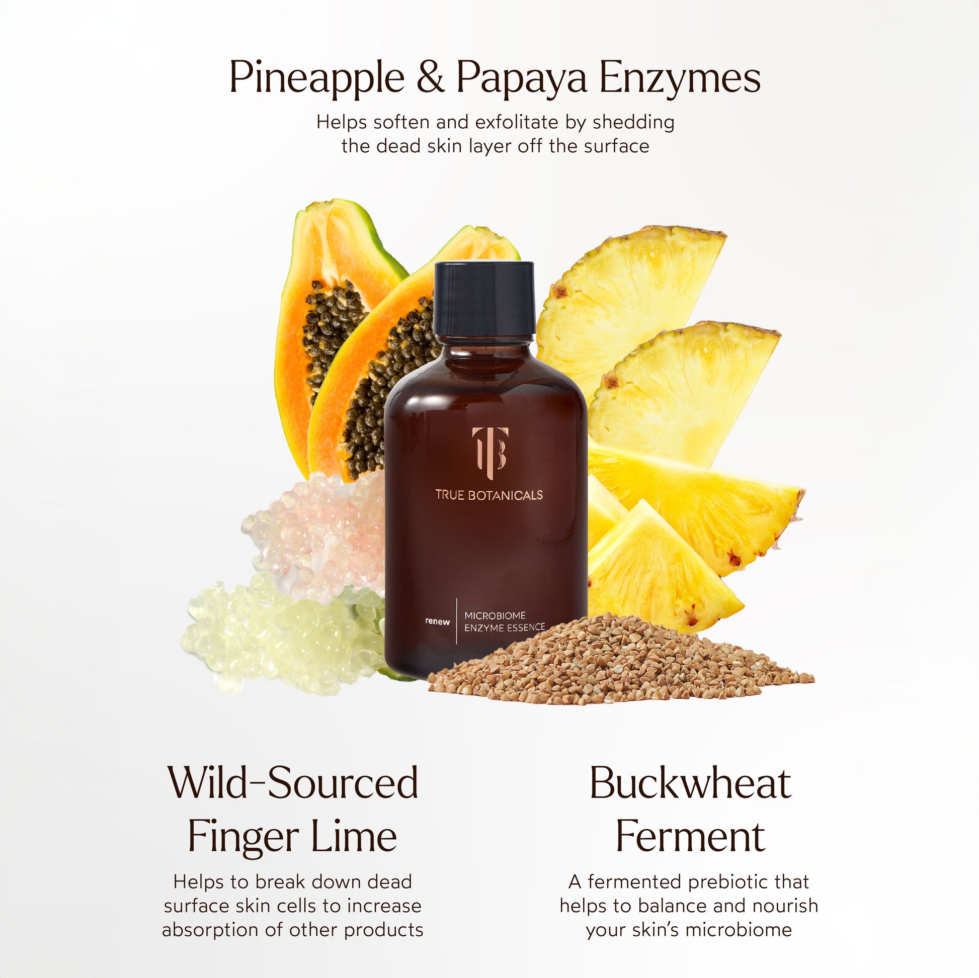 Cellular turnover is essential to a healthy microbiome, but harsh acids and abrasive exfoliants can disrupt the skin barrier and do more harm than good. This formula uses gentle, non-irritating pineapple and papaya enzymes to dissolve dull, dead skin cells on the surface, along with wild-harvested finger lime—rich in naturally occurring AHAs—to smooth and brighten. The result is a baby-soft, even-toned complexion—dewy, plump, and it even diminishes the appearance of fine lines. This next-generation essence goes beyond a prep step in your daily routine. It strengthens, balances, and protects, building the foundation for long-term skin health and radiance.