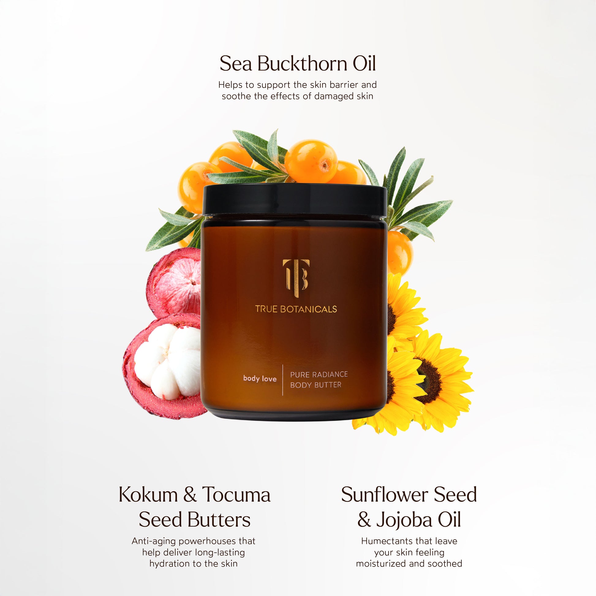 OUR ESTHETICIAN’S TIP: Exfoliate your skin with our Pure Radiance Exfoliating Sugar Scrub before applying the Body Butter for maximum absorption.